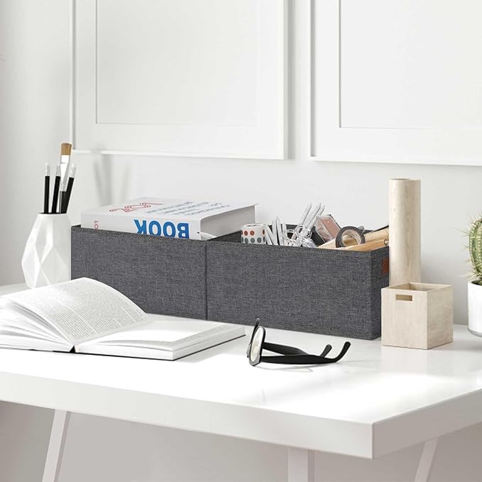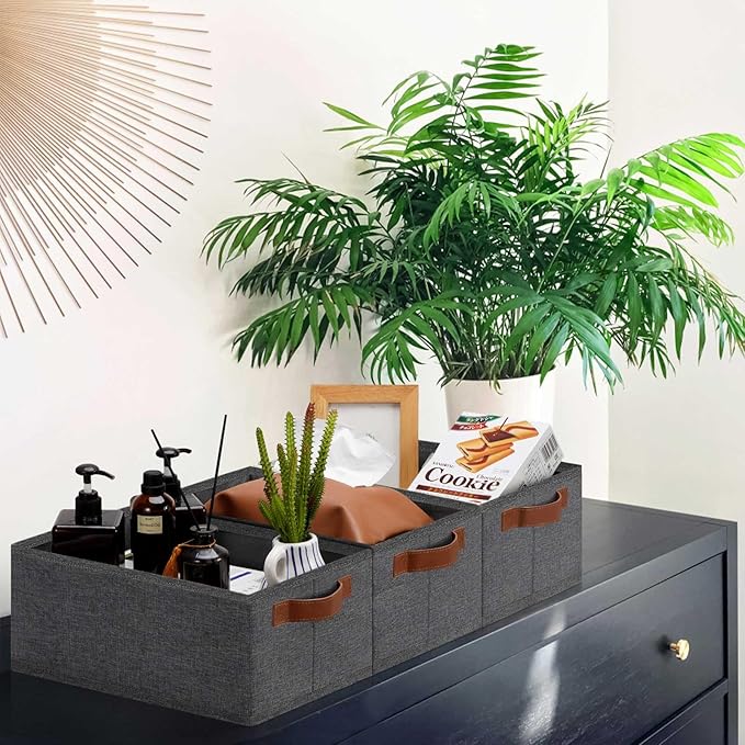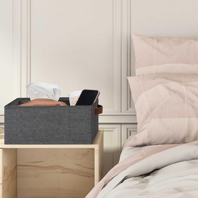 - 👍【QUALITY MATERIAL】Storage baskets for shelves are made of high-quality cationic fabric and polyester cotton fabric, and the inner layer is made of non-woven fabric, which is odorless, long-lasting and strong. Classic faux leather handles that adds a comfortable touch and provides a strong and comfort grip to pull and move. Fabric storage bin is easy to clean, just wipe with a damp sponge or cloth.
