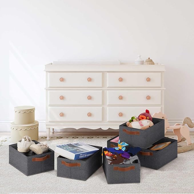 GhvyenntteS Small Fabric Storage Bins 6 Pack, 11.8" x 7.87" x 5.11" Storage Basket with Leather Handles, Closet Storage Bins for Shelves, Storage Baskets for Shelves, DVD Storage (Grey)