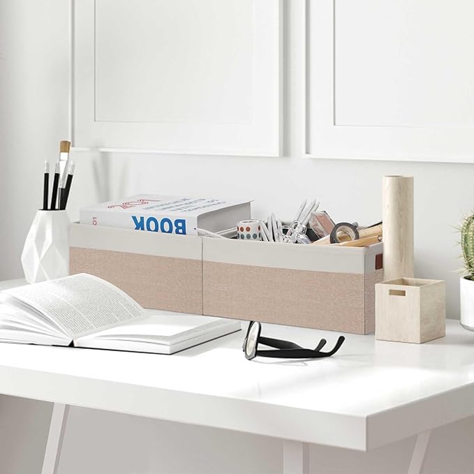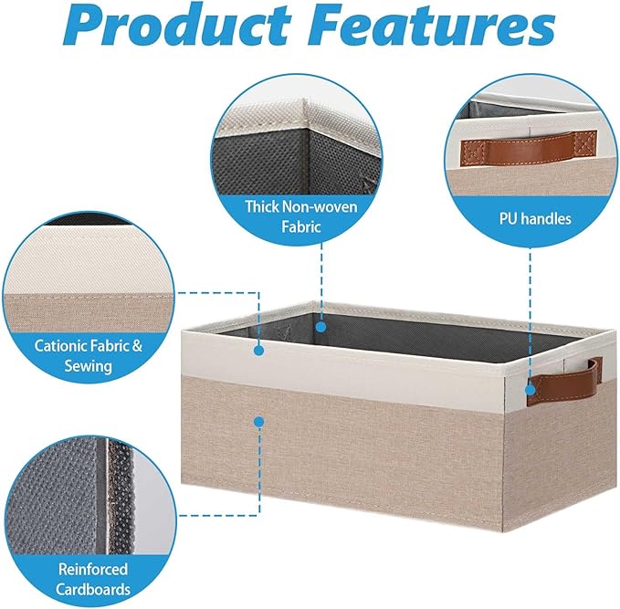- 👍【QUALITY MATERIAL】Storage baskets for shelves are made of high-quality cationic fabric and polyester cotton fabric, and the inner layer is made of non-woven fabric, which is odorless, long-lasting and strong. Classic faux leather handles that adds a comfortable touch and provides a strong and comfort grip to pull and move. Fabric storage bin is easy to clean, just wipe with a damp sponge or cloth.