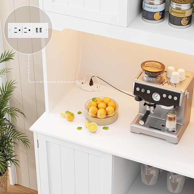 - BUILT-IN OUTLET FOR KITCHEN HUTCH: Built-in electric outlets in the pantry cabinet with storage enhance the functionality of the it which is handy for powering small appliances such as coffee makers and microwaves. Therefore, this kitchen cabinet which combines practicality and elegance, is sure to be a great choice for family gathering.