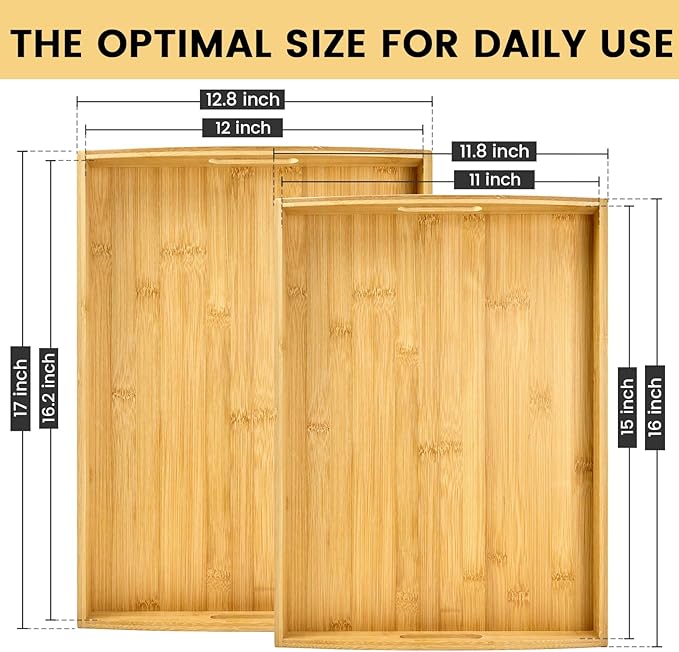 - SERVING TRAY WITH HANDLES : Our bamboo serving tray features a 1.5-inch edge height, crafted for durability and stability. It comes with two sturdy, ergonomic curved handles and raised edges, which prevent items from falling and allow for effortless transport of food and drinks