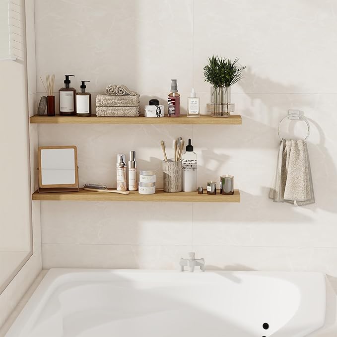 Fun Memories Floating Shelves for Wall, 40" Rustic Wood Deep Wall Mounted Shelves with Invisible Brackets for Decor & Storage, Floating Shelf for Living Room, Bathroom (Oak, Set of 2)