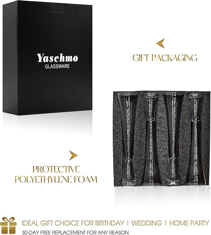 - 【Yaschmo 's Customer Service】Yaschmo champagne flutes set of 2, will bring exquisite products and our sincerity to your hands. We provide the perfect customer service and will reach out to you once received glass, make sure you have not any concern.Choose this luxury, unique gift to bring joy to friends and family, celebrating life’s simple pleasures together.