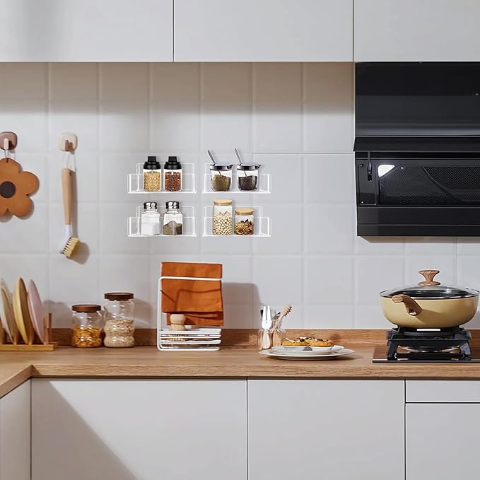 Acrylic Spice Rack Wall Mount-6 Inch, Clear Spice Shelf Storage Holder, 4 Pack Hanging Seasoning Rack Organizer for Cabinet Door, Cupboard or Wall Kitchen (Adhesive or Screw)