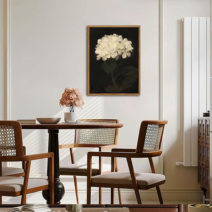 - Framed Canvas Wall Art: This vintage white hydrangea oil painting print adds a touch of botanical elegance to any room. Its classic floral design is ideal for enhancing the ambiance of your living room, bedroom, kitchen, or office with timeless charm.
