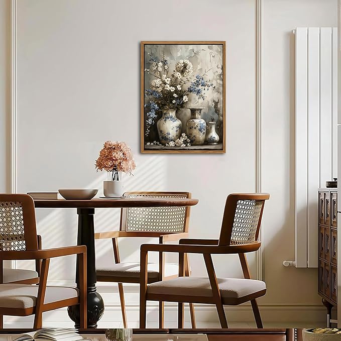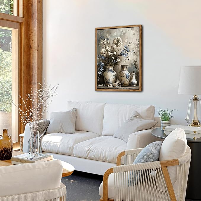 - Framed Canvas Wall Art: This vintage farmhouse floral canvas features elegant blue and white flowers in a charming art jar, capturing a timeless rustic beauty. Itโs the perfect accent to enhance your living room, bedroom, bathroom, or any cozy home corner.