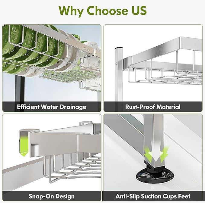 - ๐ฉ Sturdy & Rust Resistant Construction: Crafted with heavy duty stainless steel and reinforced welding, this over the sink dish drainer drying rack resists corrosion and daily wear. Its industrial grade framework securely holds bulky pots, pans, and dishware without sagging, even when fully loaded, ideal for families seeking a lasting solution to countertop clutter