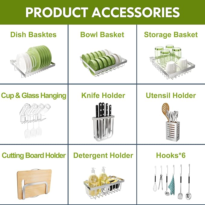 - ๐งฝ Hygienic & Easy Clean Grid Design: The seamless stainless steel surface prevents grime buildup, while the open grid metal dish drying rack structure allows quick wiping without disassembly. Removable accessories fit in sinks for deep cleaning, perfect for households prioritizing kitchen sanitation