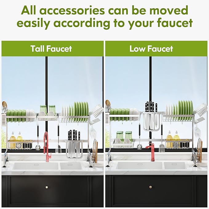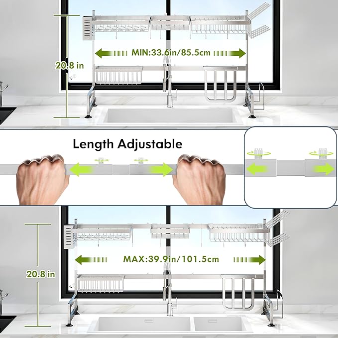 - ๐ Expandable Design for Custom Fit: Adjust the over sink dish drying rack width effortlessly to span most standard single or double sinks, adapting seamlessly to your kitchen layout. The dish drain modular design allows rearranging tiers and accessories to prioritize space for tall glasses, wide pans, or cleaning tools, maximizing vertical storage above the sink