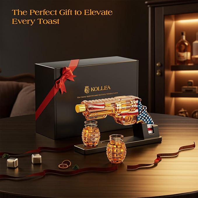 - Bold Design: Features a classic pistol-shaped design with an American flag or camouflage print, paired with two grenade-shaped shot glasses. A collectible display piece that enhances every drinking moment