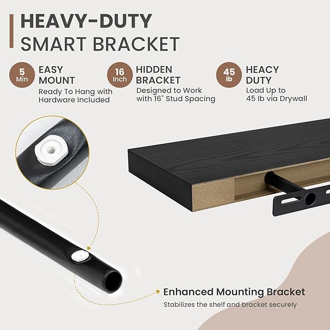- [STABLE & SECURE INSTALLATION]: Equipped with a robust, hidden mounting bracket, these 40 inche floating shelves provide solid support for your items. Designed for easy, secure installation, they include all necessary hardware for a firm, wobble-free setup, so you can confidently display decor, photos, or functional items with style.