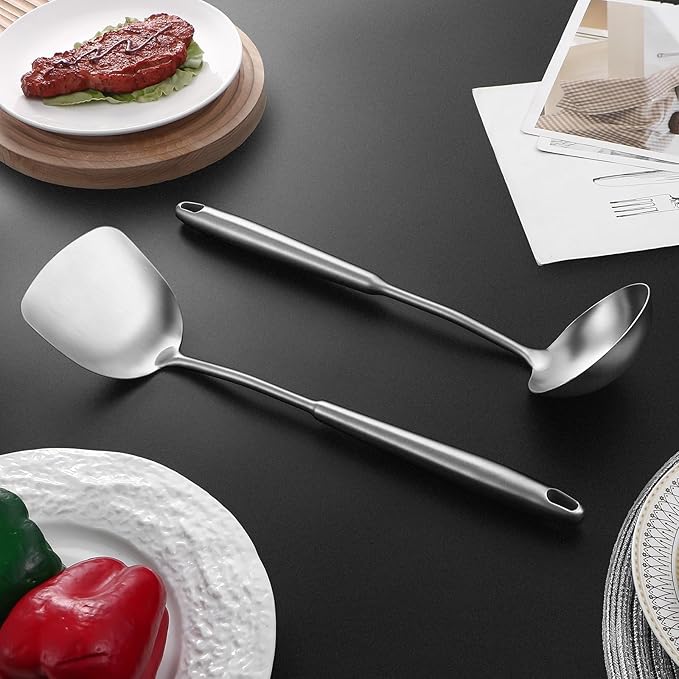 - 2 PCS Wok Tools Set: 15-inch 304 stainless steel spatula and ladle are longer than typical wooden cookware.Sufficient length ensures that our hands are kept away from the hot frying pan while we make delicious meals with ease