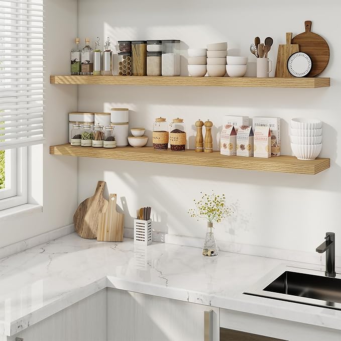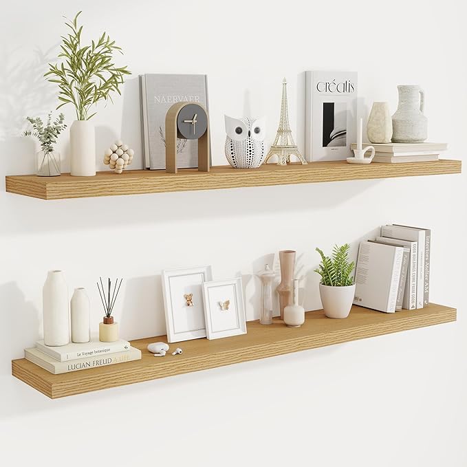 - Timeless Design for Any Room: Elevate your décor effortlessly! The classic retro texture of these floating shelves complements bathroom, bedroom, kitchen, living room or even office space. Neutral tones blend with existing furniture, adding warmth without clashing