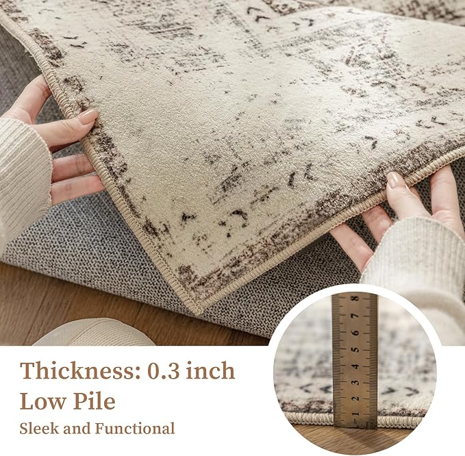 6'x9' Area Rug - Vintage Persian Medallion Design Low-Pile Faux Wool Rug, Non-Slip Backing, Machine Washable, for Living Room, Dining Room, Bedroom (Cream/Taupe)
