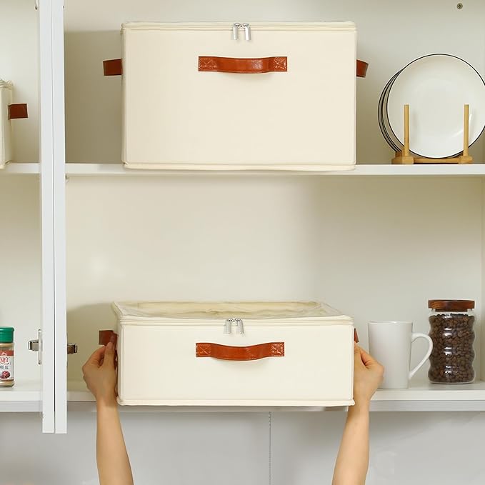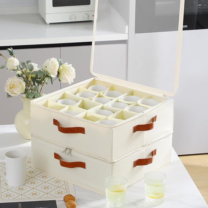 - [Reinforced Handle and Zipper ] Our mug and cup storage box with two leather handles, which makes these coffee mug storage easier to hold when they are full of mugs. Reinforce strong polyester threads to make sure the mug storage organizer doesn't break when moving your cups. The two-way zipper is made of superior stainless steel, making the opening and closing of the coffee cup storage smooth and convenient.