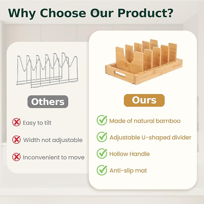 - Non-Slip Stability & Heavy-Duty Support:Four reinforced anti-skid pads on the base prevent sliding, even when fully loaded. The sturdy bamboo construction and high-rise dividers securely hold heavy lids and cookware, offering long-lasting support without wobbling