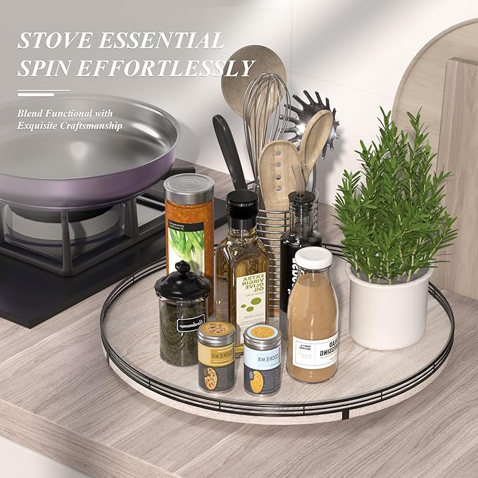 - 360 RATATING & MAXIMIZE SPACE: The base is made of solid wood and the spinning mechanism is made of steel ball bearings, which are well-built and allow for 360Β° smoothly spin. Making it super easy to access items at the back of your cabinet without having to remove everything in front. You can use it to store spices, condiments, and even small jars, and it keeps everything neatly in place.