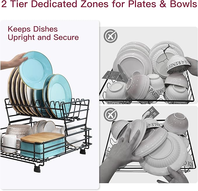 - 🔄 2-Tier Dish Rack for Kitchen Counter Storage: Dedicated zones for plates, bowls, and utensils. Sturdy frame prevents tipping—dish drainer rack keeps everything upright and secure