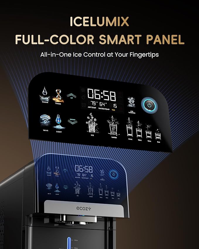 - IceLumix Full-Color Panel: Industry-first display with vibrant icons, real-time TDS and temperature. Smarter control, clearer visuals—ice-making has never looked this good