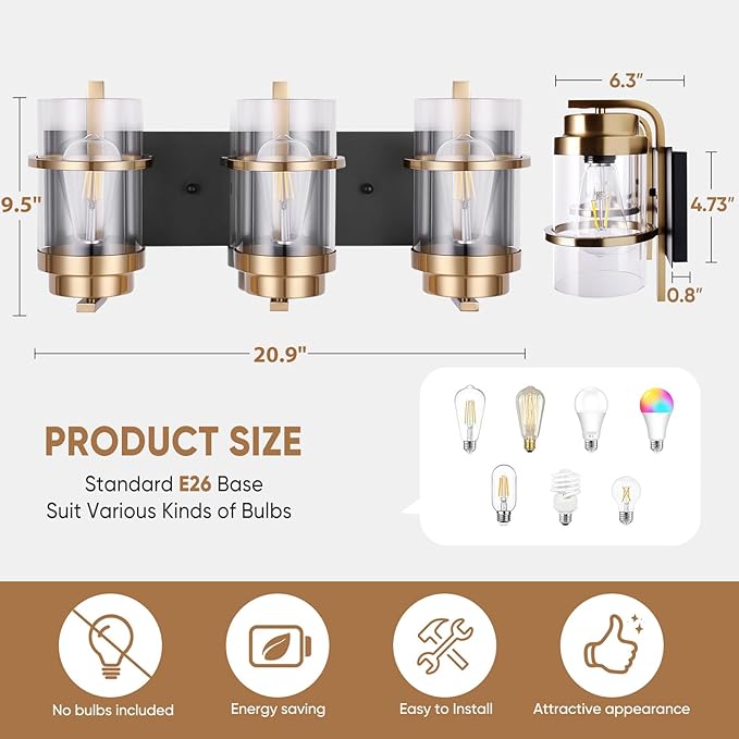 - Product Feature: Hardwired.Black gold bathroom light fixture with clear glass shade;Modern Wall Sconce lighting is easy to install and can be mounted as either up light or downlight.