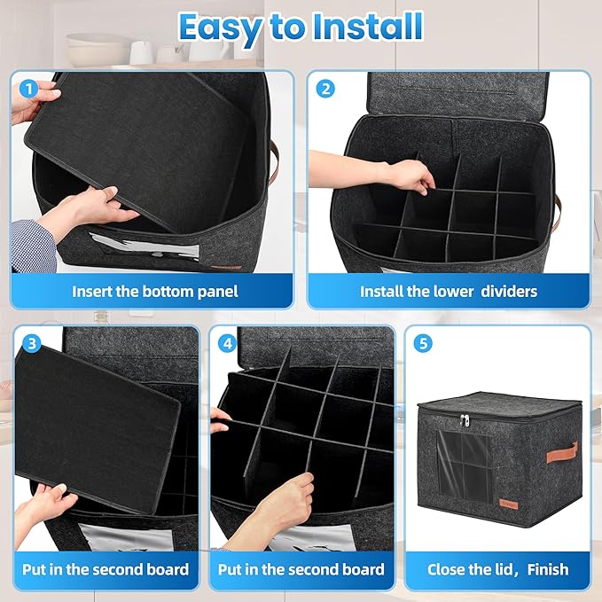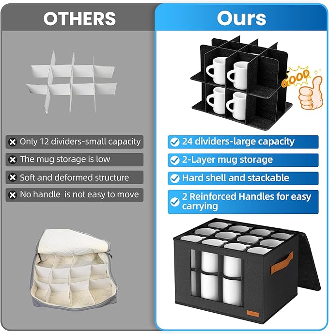 - [Premium Material & Stackable ]This mug storage box with dividers is made of beautiful and upgraded felt, which is more wear-resistant and sturdy. The rigid lid and strong interior make the mug storage organizer stackable, enabling it to save space when storing tableware in the kitchen. while also protecting your mugs, cups, ceramic cups, and glasses from dust.