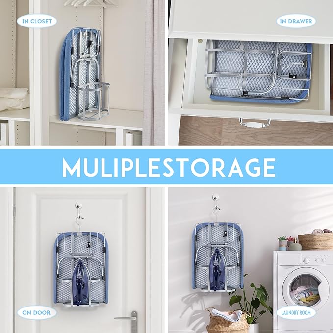 - SPACE SAVING MULTI- Scene Hero- this mini ironing board fits seamlessly into laundry rooms, dorm closets, or luggage. Its ultra-slim profile slides under beds, tucks into cabinets, or hangs vertically with the built-in elastic hook – perfect for apartments, RVs, or hotel stays.