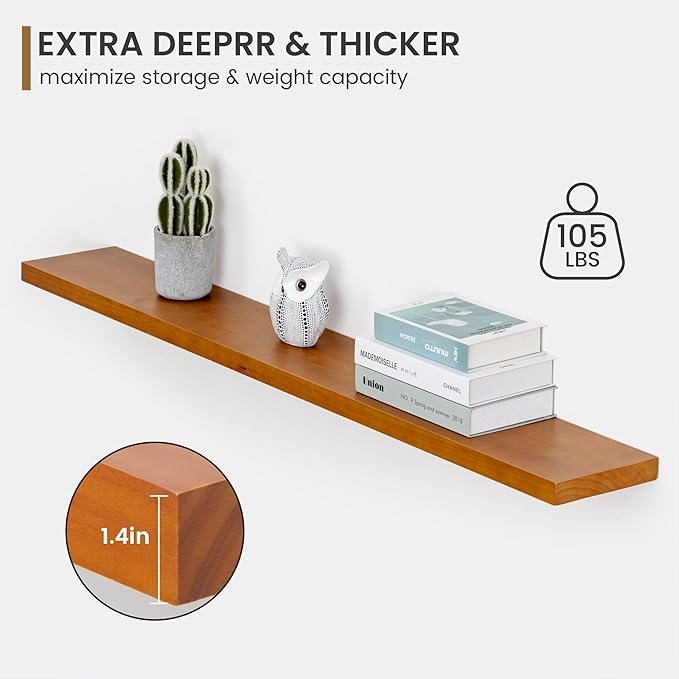 - Extra Deeper & Thicker for Storage - Each board measures 55"W x 8"D x 1.4"H. Extra deeper and thicker design in order to bring maximizes storage space and weight capacity, even hold up to 60 lb. This floating shelf taking up zero square feet, reduces clutter and highlights dΓ©cor in compact spaces. It can help make full use of the empty wall, making it much more space-saving and making your room look larger and tidier.