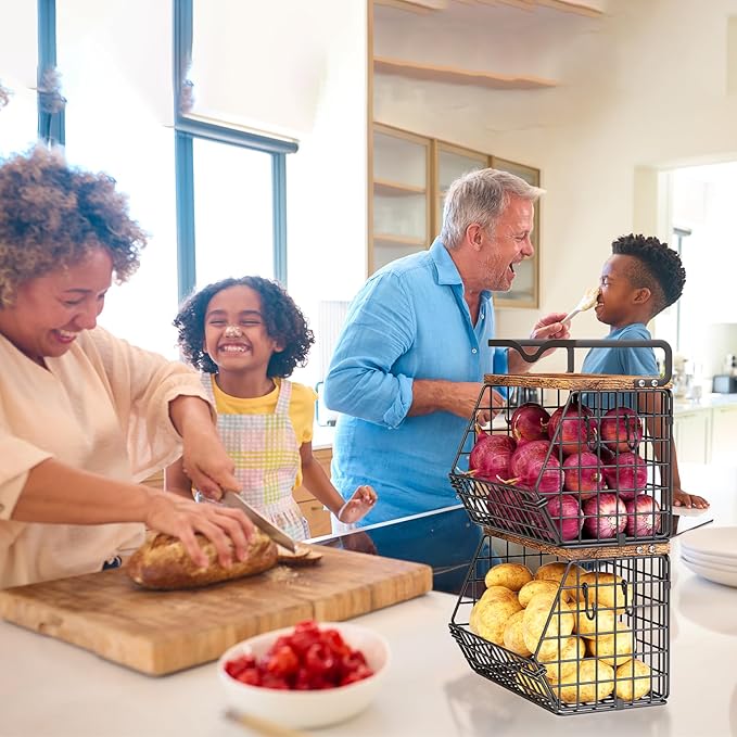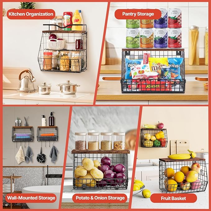 - Wall-mounted and Stackable Metal Storage Basket: This fruit basket for kitchen counter is highly versatile, offering both stackable and wall-mountable options. It includes all necessary hardware (screws and wall anchors) for secure wall mounting, freeing up valuable countertop space. The onion storage basket can be used independently or stacked to maximize space efficiency. Additionally, the top shelf features a high-quality wooden board, providing convenient storage solutions for small items, seasoning organizers, decorations, and daily necessities.
