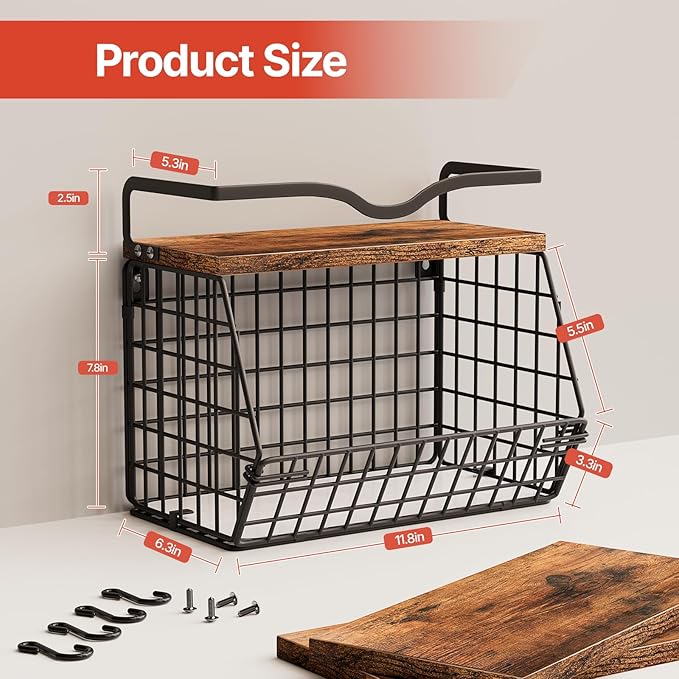 - Space-saving Design: Each set includes two black fruit baskets, measuring 11.8" in × 6.3" in × 8.6" in . These dimensions ensure minimal countertop space usage. The wooden lids on the top of the hanging storage baskets provide additional storage capacity while maintaining an organized appearance. The included hooks allow for hanging small items, further enhancing space-saving functionality.