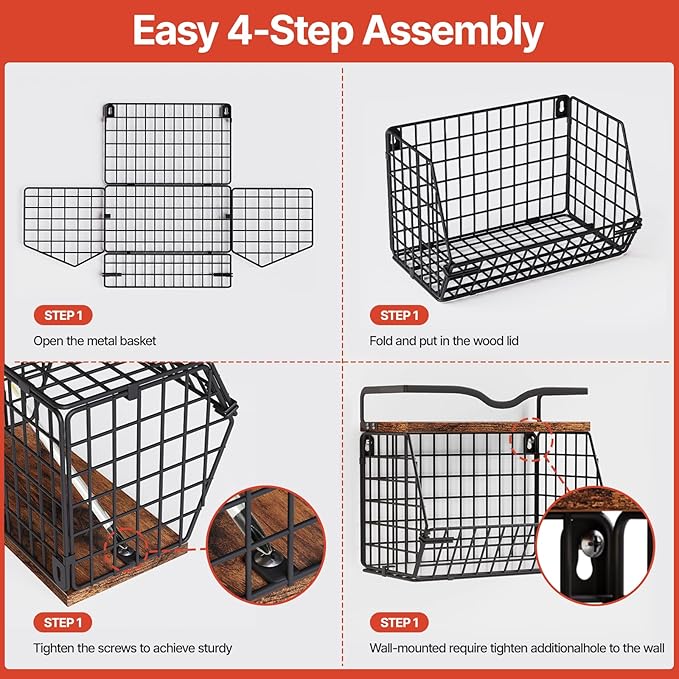 - Easy Assembly: Following the detailed instructions provided, assembly is straightforward and hassle-free. The black metal components are unfolded into their correct shapes, secured with built-in clips, and fastened to complete the metal base. The top wooden board is then fixed with three screws using the included tools. Both baskets can be fully assembled within five minutes, resulting in a sturdy and visually appealing structure.