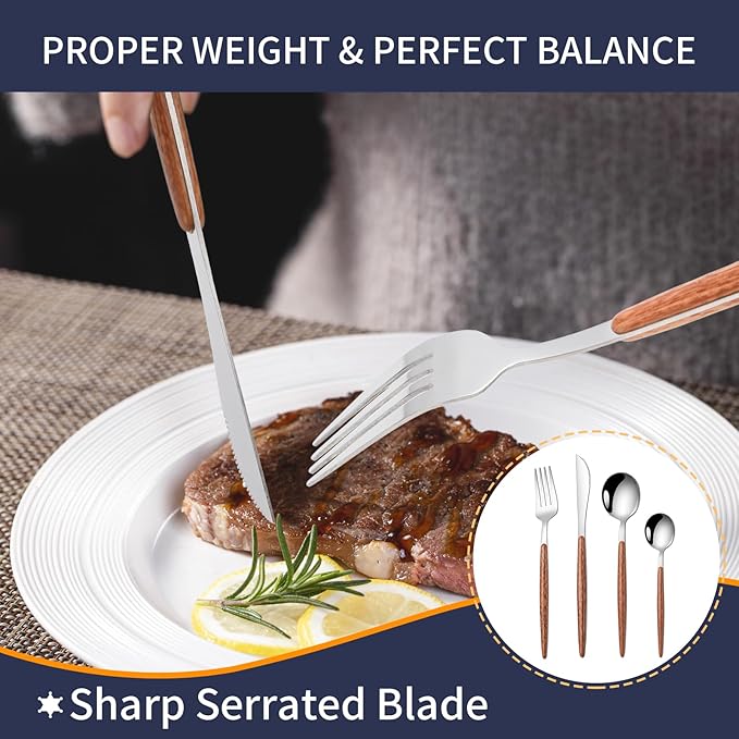 16 PCS Silverware Set for 4,Stainless Steel Flatware Cutlery Eating Utensils Set with Wood Grain Handle,Steak Knives Forks and Spoons for Home,Party,Mirror Polished and Dishwasher Safe