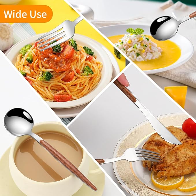 - Creative Wood-Look Handles: Crafted to command attention, these woodgrain-effect handles instantly upgrade ordinary flatware. Unlike mass-produced cutlery, the hyper-realistic texture and warm amber tones create a focal point that ensures your faux wood handle silverware set stands out