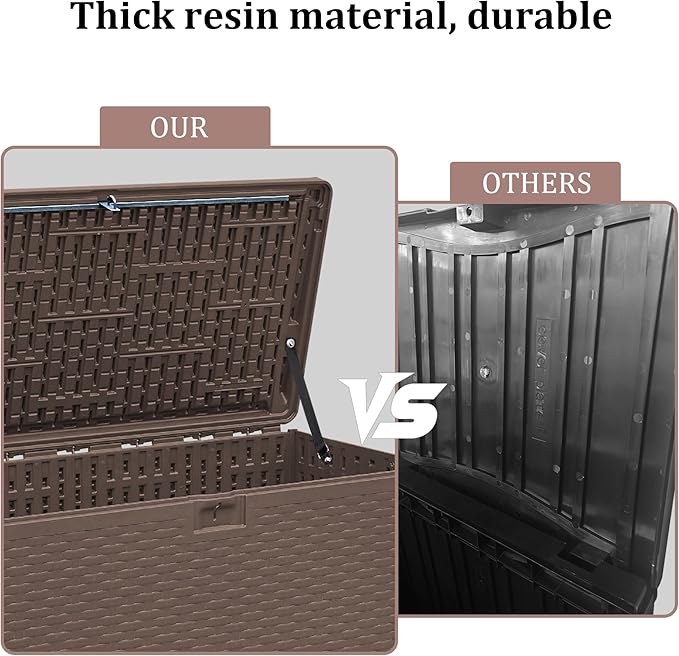 - Weatherproof Resin for Year-Round Use. Durable, waterproof resin, this deck box resists rain, sun, and UV exposure. Ideal for all-season use, it won’t peel, rust, or warp like wooden or metal boxes—keeping your items protected outdoors.