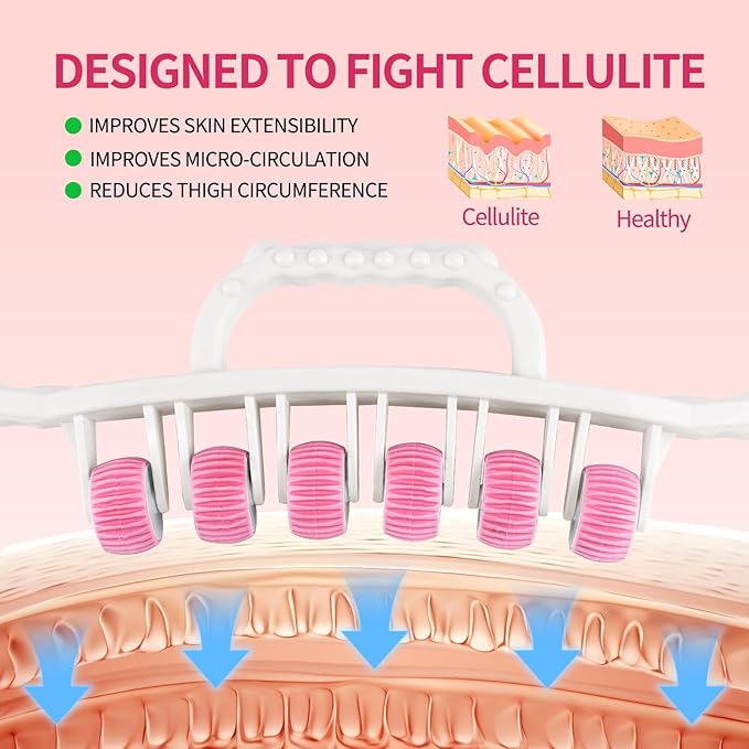 - Gentle Yet Effective Deep Tissue Massage –Designed with 6 smooth-rolling wheels, this cellulite massage tool provides a soothing experience while targeting deep muscle layers. It helps release tension,improve blood flow,and also functions as a lymphatic drainage massager—promoting lymphatic circulation without causing bruises or skin discomfort.Ideal for daily muscle care and cellulite reduction