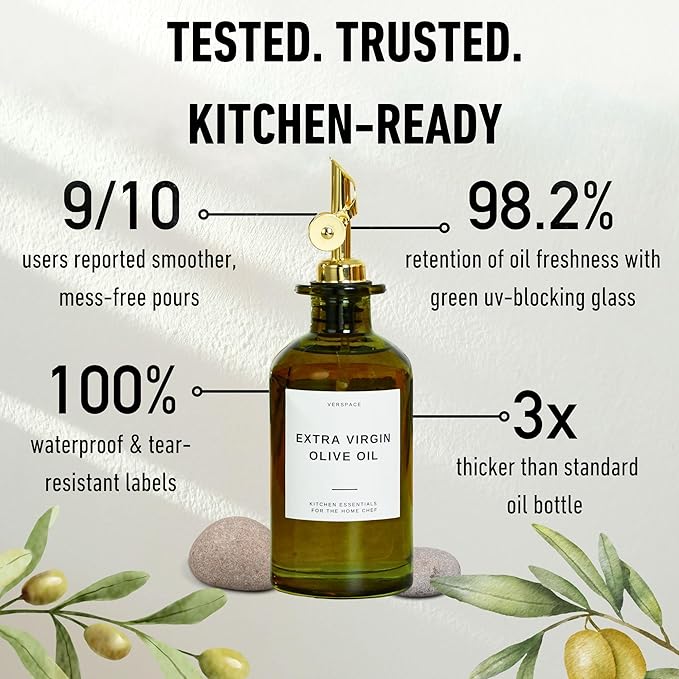 - PROTECT YOUR OIL IN STYLE: This elegant green olive oil bottle set is crafted from UV-blocking glass to preserve flavor, nutrients, and freshness. Whether you're storing extra virgin olive oil or avocado oil, your oils stay safe from sunlight and oxidation.