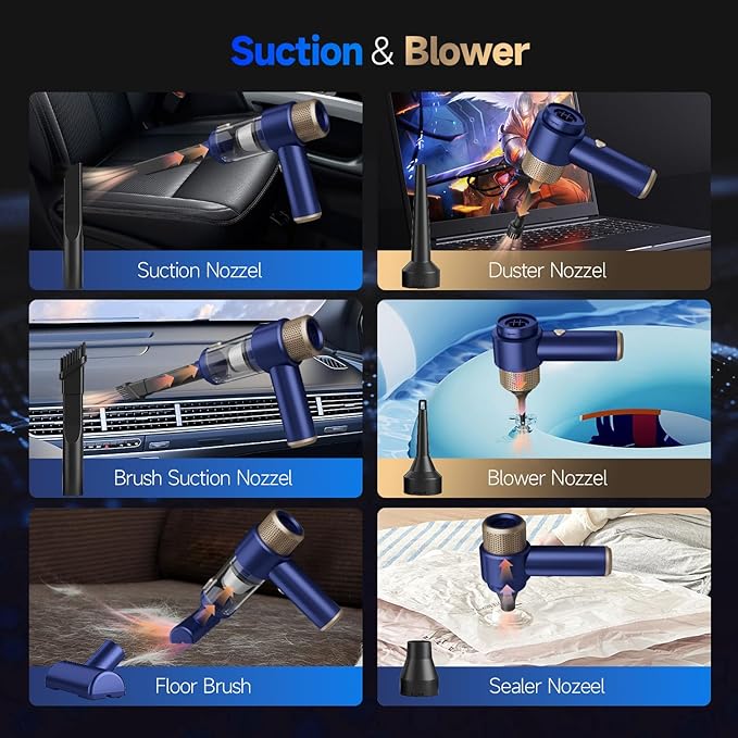 - 【7-in-1 Multifunctional Cordless Car Vacuum Cleaner】: The handheld vacuum cordless with 7 accessories supports multiple modes, such as vacuuming, blower, inflation, pump. Hand vacuum can meet different need for daily cleaning tasks and even clean hard-to-reach corners, such as blowing or vacuuming dust or debris from seats, keyboards, computer host, camera lenses and cabinet corners, or inflating or expeling air from swimming rings and mattresses, or Blow air for BBQ fire, etc