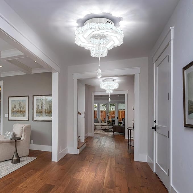 Flashing God 16 Inch Mini Chandelier Modern Crystal Chandeliers Light Semi Flush Mount Ceiling Light Fixture Small Silver Chandelier for Bedroom Hallway Kitchen Foyer