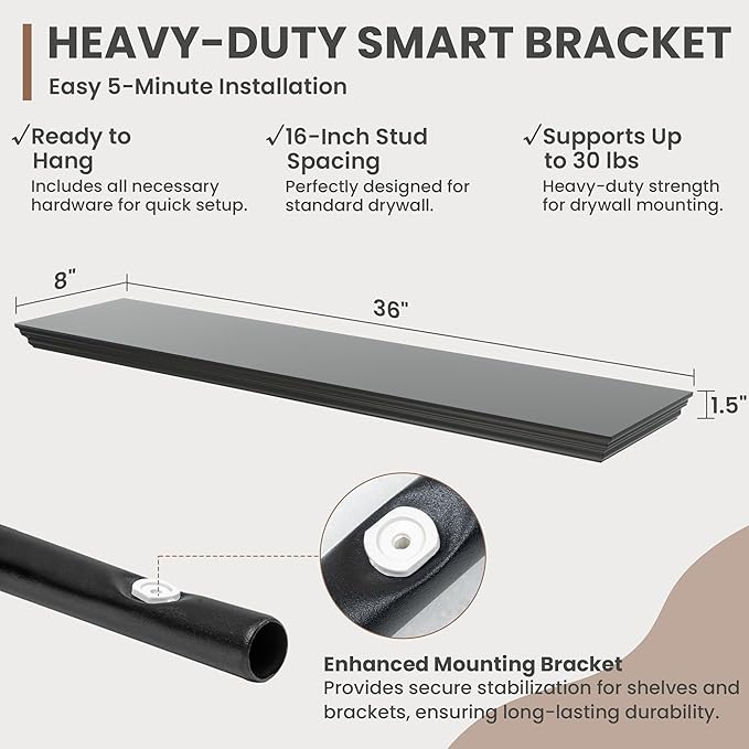 - Strong Suppoot: MDF wooden floating shelf with reinforced brackets supports heavy items effortlessly, holding up to 30 pounds. Hanging shelf's bracket has been preset with a 2° elevation to remain level and not sag after bearing heavy loads