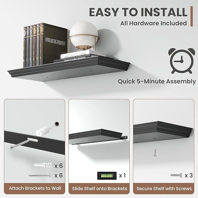 - Package Contents: 1 black floating shelf included, board dimension: 23.6" W x 7.9" D x 1.5" H. Other accessories: 1 metal brackets, 1 magnetic level, 3 wood iron connection screws, 6 wall screws and expansion tubes, and 1 installation manual