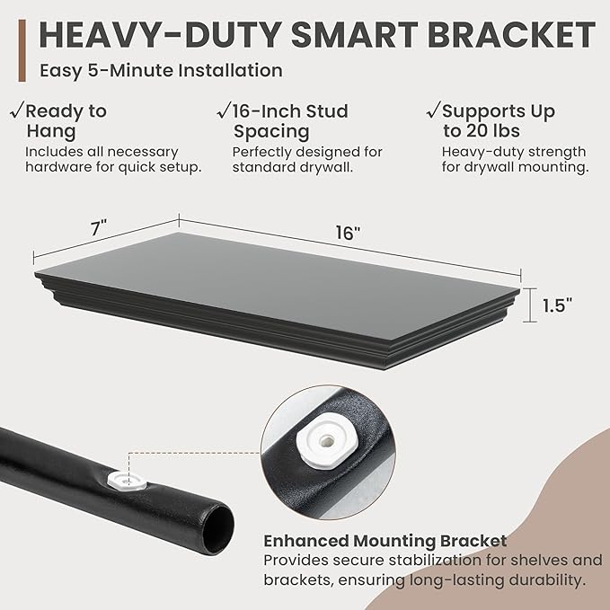 - Strong Suppoot: MDF wooden floating shelf with reinforced brackets supports heavy items effortlessly, holding up to 20 pounds. Hanging shelf's bracket has been preset with a 2° elevation to remain level and not sag after bearing heavy loads