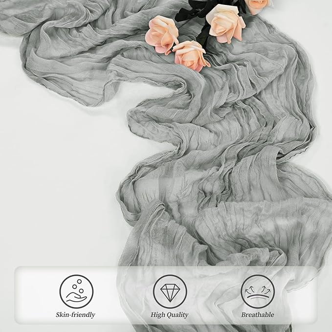 - Cheesecloth Table Runner Size: You will receive 20 gray cheesecloth tablerunner, each measuring 20 x 120 inches. The quantity is sufficient for you to decorate various romantic occasions. It can decorate most shaped tables, such as rectangular tables, round tables, and cocktail tables. It is long enough to decorate a large table and be placed perfectly and elegantly on the tabletop, adding a romantic atmosphere to your occasion.