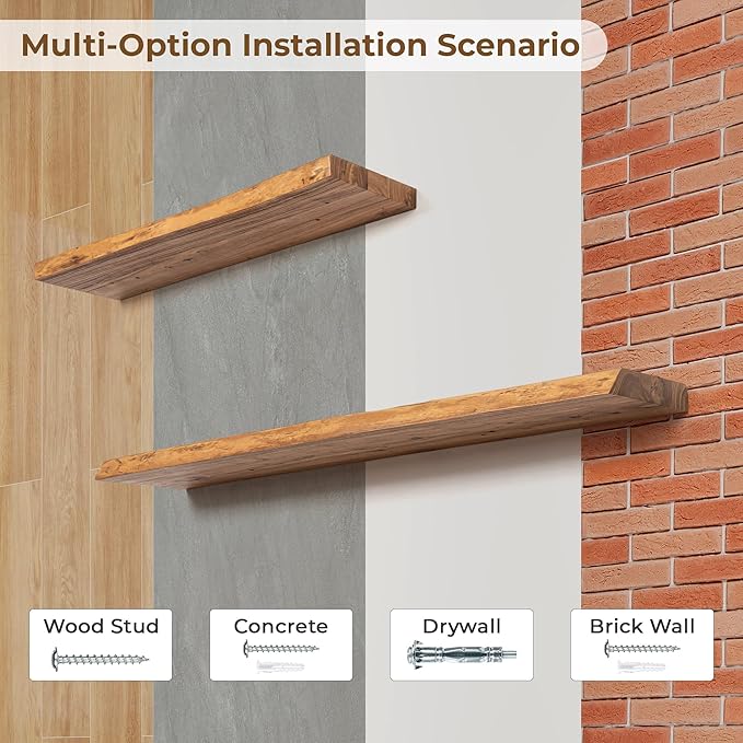 - Beautiful Live Edge: Axeman wall shelves feature real live edge wood, making each one unique and visually interesting. The irregularly curved edges add a touch of character to any space