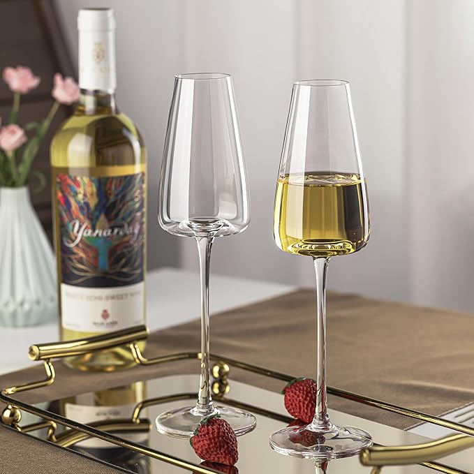- EXCELLENT DESIGN: The concave design at the bottom of the champagne increases the contact area between the champagne and the air, fully releases the aroma of champagne. The stem of the champagne flutes is slim and tall, which shakes the glass more elegantly. The champagne glasses brings you a more professional experience.