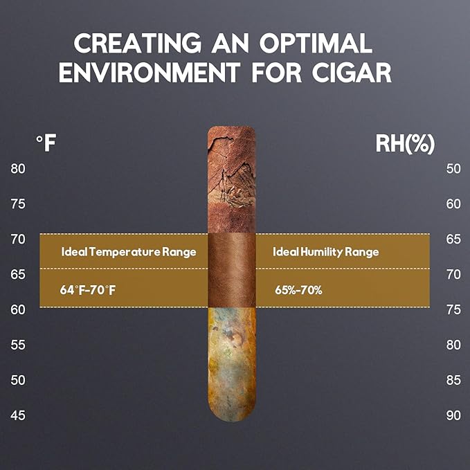 - 【One Touch Control of Temp and Humidity】Our cigar humidor cabinet has a temperature control range of 59-72°F (15-22°C) and a humidity control range of 60%-75%. Built-in large capacity water tank with a thick sponge, so you don't need to refill water frequently. 360° frost-free air-cooling technology keeps the temperature and humidity at a constant level at every location inside to promote the aging and maturing of your cigars. Energy-saving design, power consumption is < 0.25 kWh/24 hours, cost is < $0.05/day.
