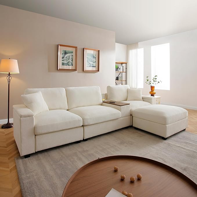 120.3" Modern L-Shaped Sectional Sofa with 360°Swivel Drop-Down Table, Storage Armrest, USB Ports & Movable Storage Ottoman – Plush Linen Cloud Couch for Lounge (Beige)