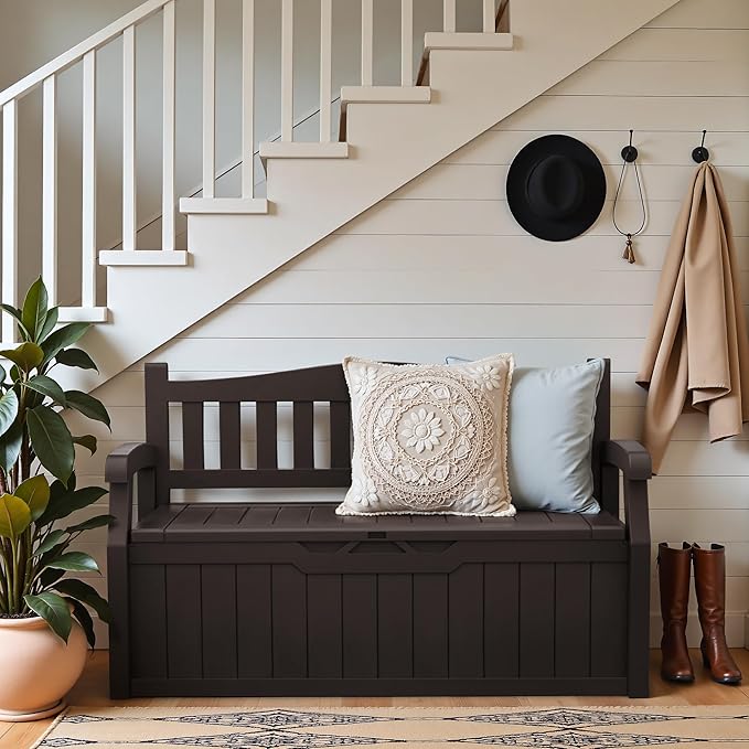 Greesum 80 Gallon Outdoor Storage Bench, Resin Patio Furniture with Armrest,Waterproof and UV-Resistant, Perfect to Garden, Poolside and Lawn, Dark Brown