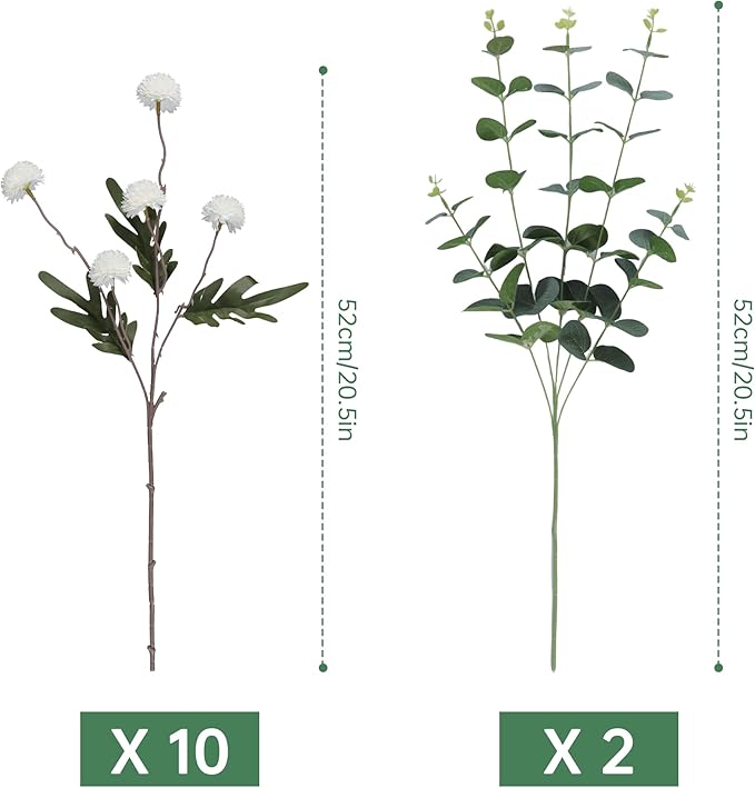 - Size: Each faux mums flowers stems is about 20 inches long and the eucalyptus stems are about 15 inches long, Each stem features soft petals and vibrant colors, ensuring these faux silk pompon mum artificial flowers will brighten any home decor, making them ideal for DIY bouquets