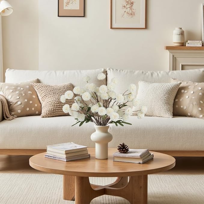 - Elegant White Faux Kiku Flowers: This autumn artificial chrysanthemums flowers mimics the beauty of a real flower while providing long-lasting appeal, with eucalyptus sprigs and simulated plant stems for a sophisticated and timeless look that is perfect for fall table centerpieces or wedding decorations. Each set includes 10 white chrysanthemum stems and 2 eucalyptus branches