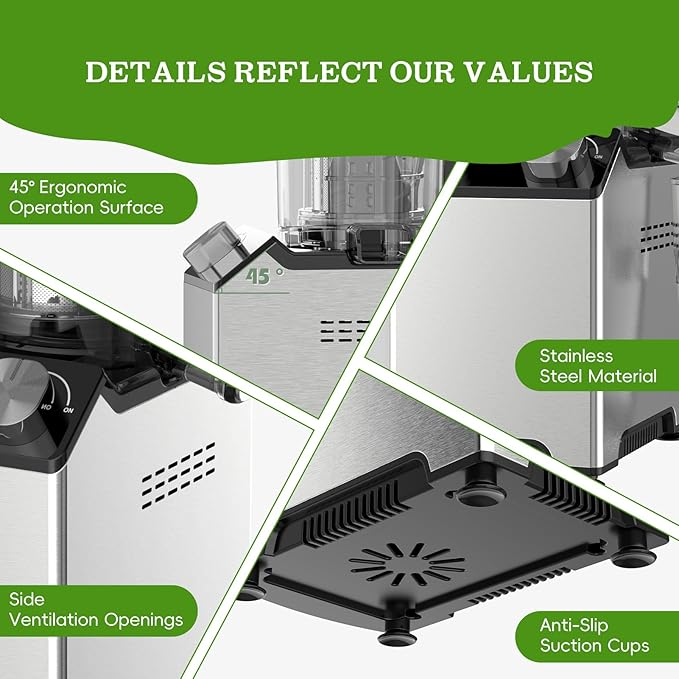 - 【Designed with Your Experience in Mind】: This electric juicer incorporates many thoughtful design details: a comfortable 45° angled control panel, a durable stainless steel body shell, an enhanced cooling system to extend its lifespan, and non-slip, vibration-absorbing suction cups... These innovative features are all intended to provide you with an exceptional user experience!
