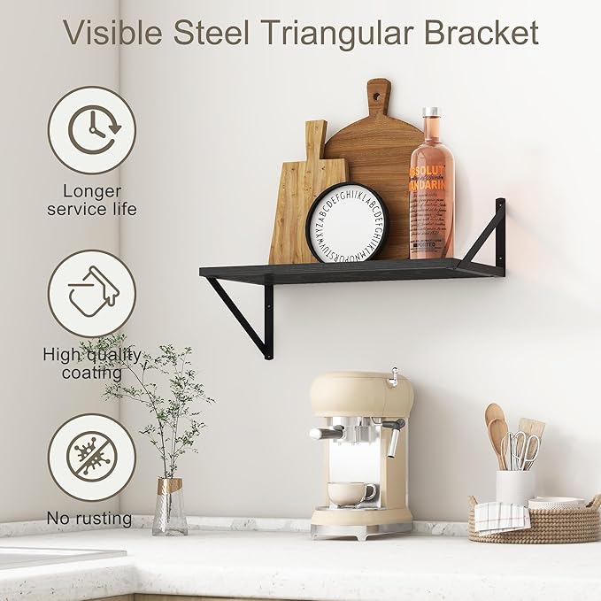 - 【FARMHOUSE RUSTIC WALL SHELF】These floating shelves are made of premium engineered wood board and visible triangular bracket. The rustic wooden grain surface add character and warmth to any modern or traditional interior with these deep floating shelves, contrast shelves at staggering heights on the wall or mount side-by-side or in the corner for a clean streamlined look.